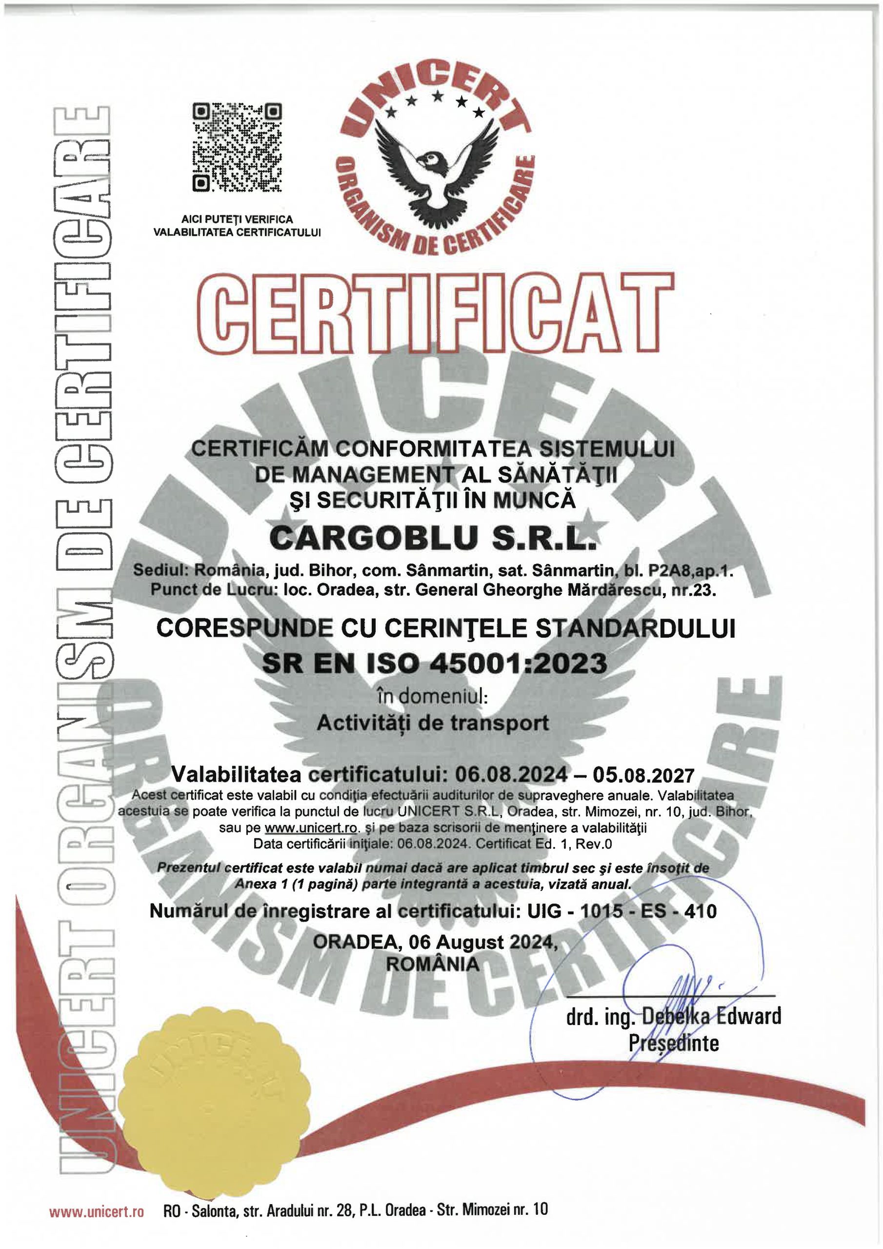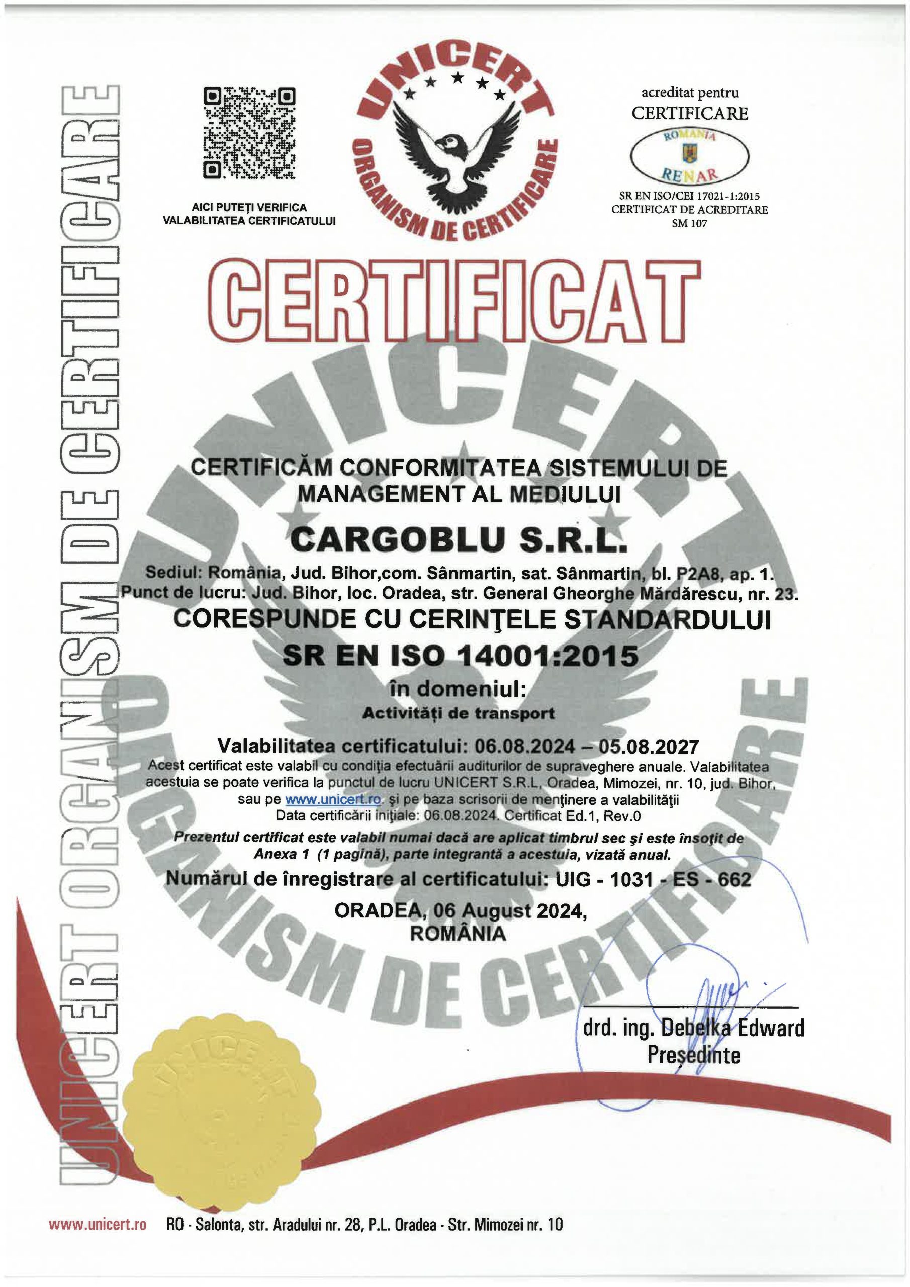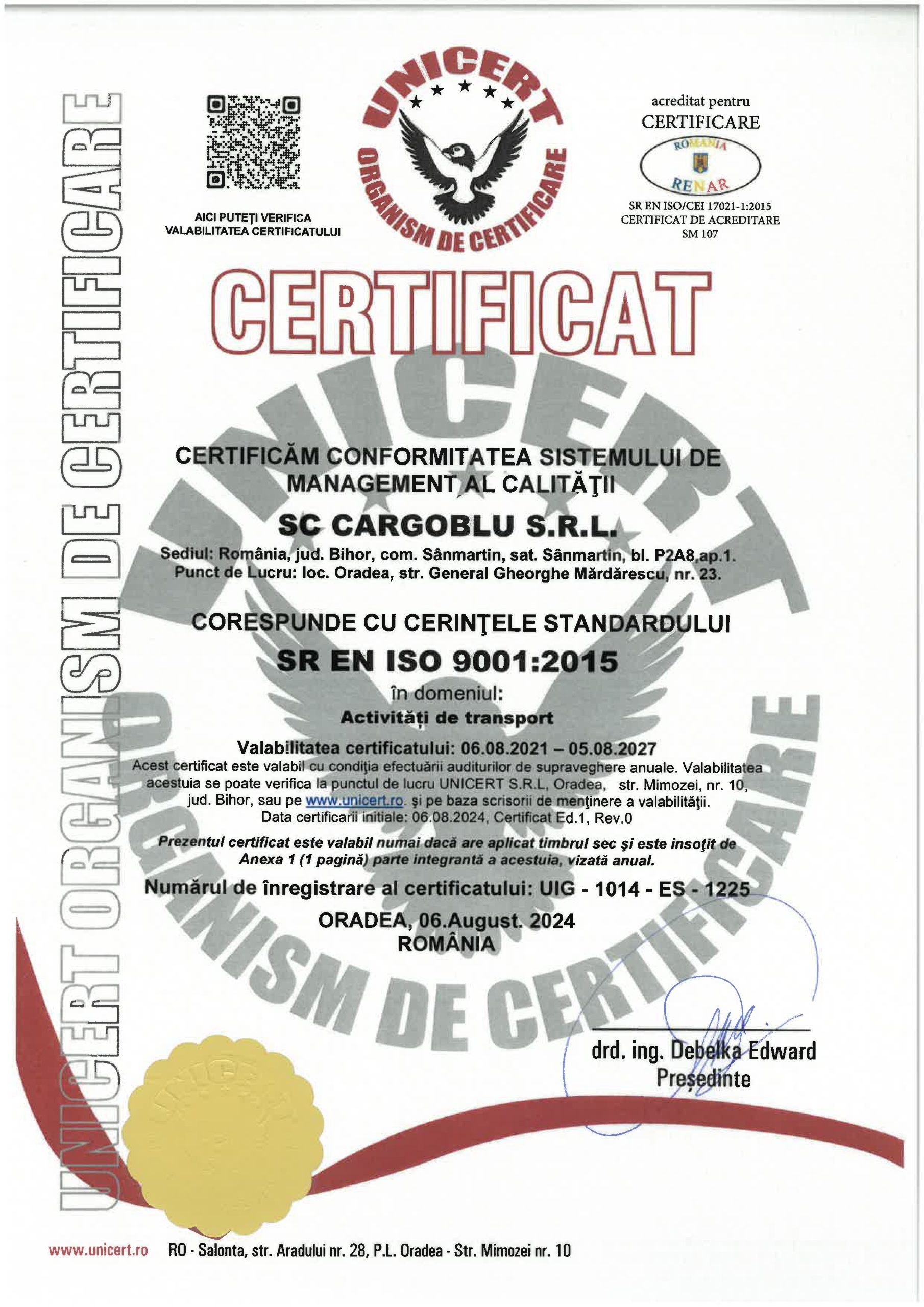 În cadrul companiei noastre, ne angajăm să oferim produse/servicii de calitate superioară care îndeplinesc cele mai înalte standarde din industrie. Certificările noastre reflectă dedicarea noastră pentru excelență, siguranță și conformitate. Certificările noastre asigură faptul că procesele noastre sunt eficiente și îndeplinesc standardele globale, cât si faptul că ne îmbunătățim continuu pentru a ne servi mai bine clienții.
